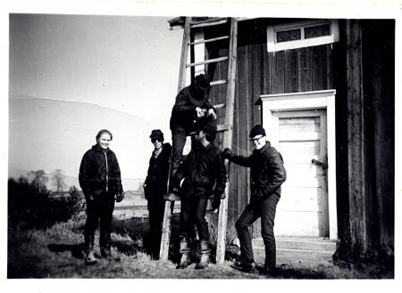 Vid ”Finnis stugon” på Bodstranden: Fr.v. Kjell Hinders, Alf Gunnar Wasberg, Henrik Örn (på stegen) och Bernhard Smeds. Ester Frantz (Smedis Ester) bodde i stugan tills hon flyttade till Trättgärdet med Albin Strandberg. Stugan kallades också "kontoristis"