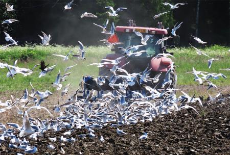 Sören Strandberg plöjde midsommartiden 2024 i Plunsen med en femskärig plog . Skratmåsar och Fiskmåsar hittar ätbart.