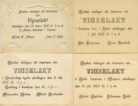 Inbjudan till vigsel 1915-1937. Uppe till vänster gifter amerikafararen och sågägaren Johannes Öijar med Hilda Åman från Hellbäs. Uppe till höger kallas till bröllop mellan Ida Forsman från Kuni och Einar Sandvik från Voitby. Se bild 1041.00