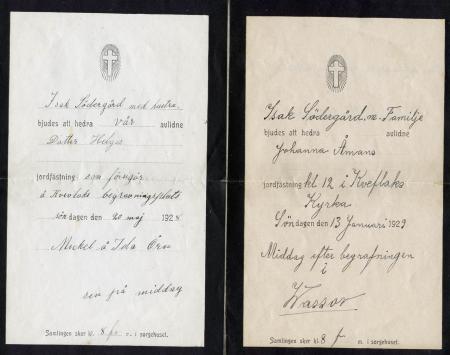 På högra kortet bjudes till begravning av Johanna Åman f. Örn 1868. Hennes man Isak Abrahamsson Åman dog 1911. De var barnlösa och tog Johannas systerson Edvard till fosterson. Bakpå kortet står: Isak uppassare och Maija Kock. Holda kaffeuppassare. Ockå den samlingen skedde kl. 8 på förmiddagen.