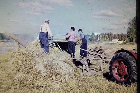 Johannes Wik (Grånn-Iisakas) tröskar på Rössle. Hans hustru Elisabeth Wik skär upp och Johannes matar in sädskärvarna. Den som lyfter banden på bordet är Bernhard Lönngren (pastor). Traktorn är en Brown och tiden början av 50-talet. Säden kom i säckar.
