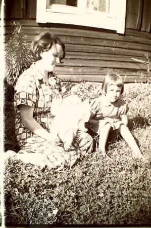 Gertrud Wiik med barn vid framför deras hemgård, "Battjis", på Laggen. Flickan är Barbro Wiik och Gertrud har Bjarne Wiik i famnen.