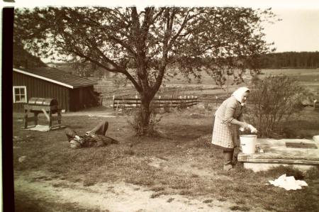 På "fäggoålin" vid Åbergs. Ingrid Åberg han en tvätt på gång. Arvid Åberg har "kastat sig" på gräsmattan framför tegelhuset. Där står också gifttunnan där utsädet betades med bladan som senare förbjöds.