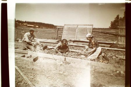 Också vid Åbergs försökte man sig på kålodling. Kanske den kunde ge någon extra slant, men den blev inte långvarig. Foder åt korna var viktigare. Arvid Åberg, Vivan Åberg och Ingrid Åberg.