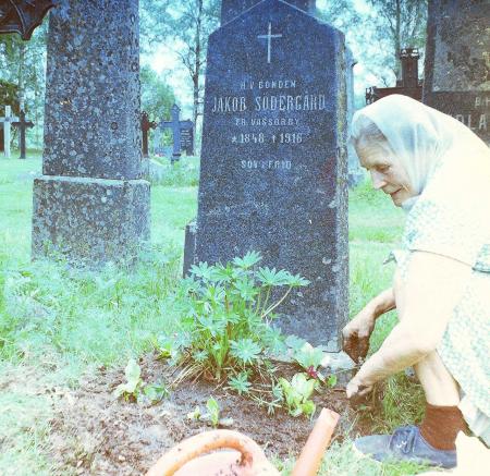 Gerda Åberg sköter om sin morfars grav i Kvevlax. Jakob Södergård föddes 1837 på Åman. Dödsdatum är fel på stenen. Hildur Mälsor skötte graven turvis med Gerda. Jakob Jakobsson Södergård var deras morfar.