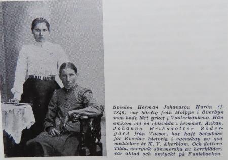 Johanna Eriksdotter Södergård är född 1844 på Västerback i Vassor. Hennes far var tre gånger gift och ägde halva Västerback (Jossas/Nässlin) och brodern andra halvan (Udd/Åberg). Johanna var fosterdotter hos Gustav Eriksson Norrgård i Kvevlax och gifte sig med Herman Johansson Hurén som senare hade bysmedja i Kvevlax.