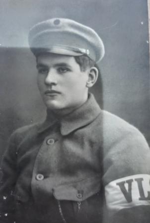 Johannes Frantz i skyddskårsuniform. Johannes är född 1901 i Vassor. Han emigrerade till USA och gifte sig med Rose. De besökte hemgården 1951 och hade då filmkamera med. Hans far är Karl Frantz född 1871 på torpet Frans under Tottesunds boställe. År 1901 övertar Karl Smeds militärboställe i Vassor. Han och sönerna Teodor och Ernst inlöser senare delar av bostället. Han gifte sig med Maria Josefina Fors och bodde några år på bostället hos sin svärfar Anders Fors där de tre äldsta barnen är födda. Efter Josefinas död 1918 gifte han sig med Johanna Östman (Bjynis). På andra bilder finns Karl tillsammans med sin bror Johannes Frantzén i rysk militärunifor.