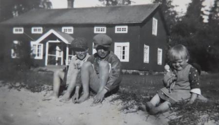 Gunvor Nyman g. Forsell sitter längst till höger. De övriga är Stig Heir och Erik Nyman. Gunvor är född 1932 i Tottesund och gift med Gösta Forsell. De sitter framför inspektörsbostaden på bostället. Bostaden kallas i äldre handlingar Östra flygelbyggnaden. I boställsinventeringen 1919 var både Västra och Östra flygelbyggnaderna lika stora 16 x 7,5 x 4 m. Sigrid och Johannes Nyman beklädde stugan med mineritplattor.