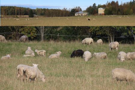 Hans Örnbergs fårfarm. Hans har varit fårfarmare sedan 2010. Då bilden togs hösten 2025 hade han ca 100 tackor och 130 lamm. Han har tidvis haft 300 får. På bilden betar fåren vid hemgården på Getan "Geiton". De har också betat strandängarna från Stornäsholmen (Tesses Café) och norrut mot Hästen och på Kilen.