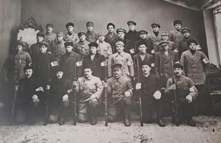 Fotografi taget av Maxmo skyddskår 1918 från årsparaden efter frihetskriget. Här finns också slyddskårister med Vassoranknytning.