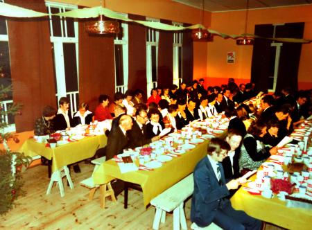 Kvevlax Spellmansgille hade bjudit in Vörå Spelmansklubb till gemensam julfest i Vassor 1976. Jan-Erik Kjellman som själv spelat i Kvevlax Spelmansgille har fotograferat.