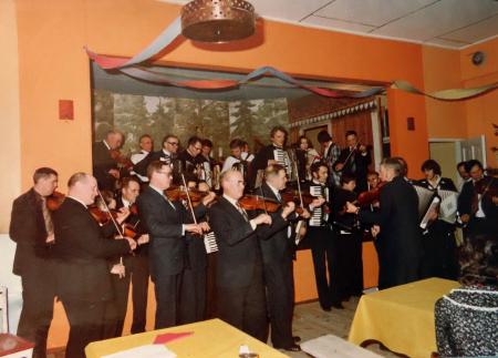 Kvevlax Spellmansgille och Vörå Spelmansklubb hade gemensam julfest i Vassor 1976. Jan-Erik Kjellman som själv spelat i Kvevlax spelmansgille har fotograferat.