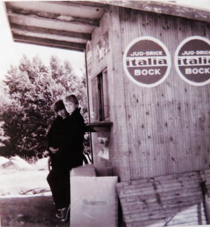 Kiosken i Kunisundet. Kirsti Koivisto till höger. Kiosken stod på samma sida om riksvägen som butiken (södra sidan).