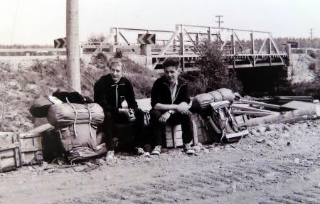 Bron över Mälsorkanal i Vallvik 19.6.1972 Jan-Erik Kjellman (t.v.) och Alfons Bäck. Jan-Erik och Alfons gick med packning från Västerhankmo till midsommardansen i Maxmo ”Gubbholms badet”.
