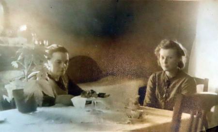 Irene Hinders och Elna Wik. Irene bodde på bodstranden "Strandrieni" och Elna vid Nysto "Nyystoelna". Bo Beijar äger Nysto 2026.