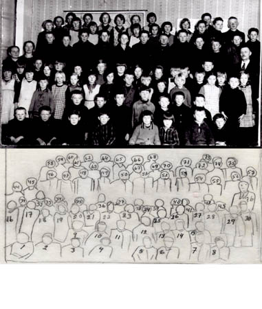 Elever i Vassor folkskola 34. Klasserna 1 – 6: 1. Harry Udd, 2. Erik Örn (fr. Västerbacken), 3. Edvin Enroth, 4. Fjalar Ahlskog, 5. Barbro Ahlskog, 6. Gun Ahlskog, 7. Olof Öijar, 8. Sven Norrgård, 9. Nils Åhman, 10. Artur Örn, 11. Knut Jansson, 12. Lars Stenmark, 13. Sven Ivars, 14. Gösta Örn, 15. Oskar Rabb, 16. Rut Östman g. Åman, 17. Elsa Östman g. Silen, 18. Aili Rabb, 19. Elin Rabb f. Nygård, 20. Etel Rabb f. Wik, 21. Verna Udd, 22. Ellen Rabb f. Örn, 23. Gösta Forsell, 24. Ingegerd Enroth f. Beijar, 25. Lilly Beijar, 26. Gunnel Vestergård g. Wik, 27. Signhild Vinberg f. Storbacka, 28. Alice Rabb, 29. Johannes Wiik, 30. Ingrid Norrback f. Wik, 31. Hilda Fant f. Östman, 32. Alice Uddström, 33. Ada Öijar, 34. Ester Rabb, 35. Mildred Rabb, 36. Vera Örn f. Wasberg, 37. Elin Storbacka g. Örn g. Lövgård, 38 Greta Vestergård f. Frantz, 39. Sven Vestergård, 40. Gunhild Beijar, 41. Valfrid Wasberg, 42. Gösta Wasberg, 43. Ragnhild Storskrubb f. Rabb, 44. Irene Ahlskog, lärare, 45. Ellen Berg lärare, 46. Arne Rabb, 47. Edvin Rabb, 48. Sanfrid Beijar, 49. Helge Örn, 50. Paul Udd, 51. Gunnar Dahlberg, 52. Emil Lundberg, 53. Erik Örn (Brännback), 54. Robert Östman (Norrstu), 55. Erik Ahlskog, 56. Sven Lundberg, 57. Anders Sandén, 58. Ines Öijar, 59. Dagny Smeds f. Strandberg, 60. Ester Örn g. Lundberg, 61. Else Heir, 62. Linnea Uddström, 63. Saga Örnberg f. Wik, 64. Elna Norrgran f. Wik, 65. Brita Majalin f. Rabb, 66 Agnes Ek f. Öijar, 67 Gunhild Östman, 68 Alice Södergård f. Östman, 69 Senny Nykvist f. Örn, 70. Elvi Skräddar f. Rabb, 71. Heidi Stenmark, 72. Ralf Norrgran, 73. Valdemar Storbacka, 74. Birger Frantz, 75. Ernfrid Wik, 76. Victor Ahlskog, lärare.