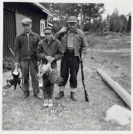 Tre jägare, Erik Lundberg, Håkan Lundberg och Alfred Lundberg. Erik Lundberg med en orrtupp, Håkan Lundberg håller i en tung tjädertupp och Alfred Lundberg är den stolta skytten.