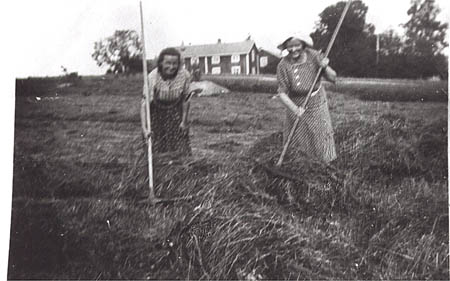 På höängen i Högåkern, Edit Storbacka, Gerda Sucksdorf (g. med en läkare, hyrde sågägarbostaden, Lägergården, på Årådden), i bakgrunden Nybergs och Nygols.