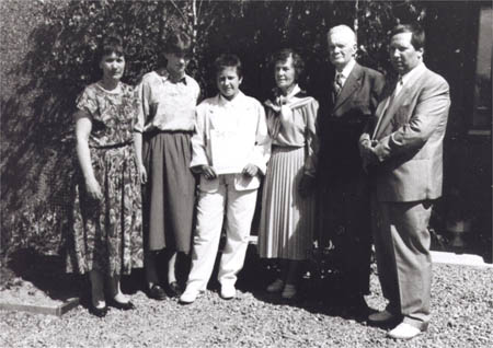 Elna Forsman och Lennart Forsman med barn, barnbarn och svärson. Från vänster: 1. Doris Forsman g. Eriksson, 2. Annika Eriksson, 3. Andreas Eriksson, 4. Elna Forsman, 5. Lennart Forsman, 6. Jan-Ingmar Eriksson från Vörå Tuckor.