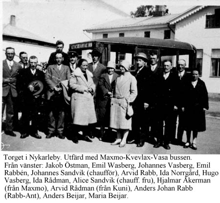 Torget i Nykarleby. Från vänster: Jakob Östman, Emil Vasberg, Johannes Vasberg, Emil Rabbén, Johannes Sandvik chaufför, Arvid Rabb, Irene Ahlskog, Hugo Vasberg, Ida Rådman, Alice Sandvik, chaufförens fru, Hjalmar Åkerman från Maxmo, Arvid Rådman från Kuni, Anders Johan Rabb (Rabb-Ant), Anders Beijar, Maria Beijar. Utfärd med Maxmo-Kvevlax-Vasa bussen.