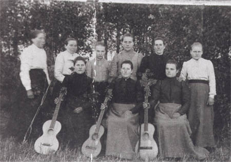 Ett frikyrkligt strängband från 1910-talet. Sittande från vänster: 1 Maria Södergård g. Åberg, 2. Elisabet Wickström g. Lövsund, 3. Anna Wickström g. Carlsson. Stående från vänster: 4. Anna Maria Wik g. Strandberg ”Strandbärgas Anna Majja”, 5 Maria Viklund g. Udd (Strand-Mari), 6. Anna Lisa Wik (Nytomt), 7. Johanna Östman g. Söderberg (Norrstu), 8. Beata Södergård (Norribyn) och 9. Ida Udd (Uddström). De hörde till Österhankmo baptistförsamling eller missionsförbundet. Bönehuset på Norrstu byggdes gemensamt av de frikyrkliga.