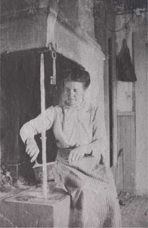 Edla Wickström (1879–1925) rör om i grötkastrull. Edla Wickström skrev dagbok under år 1907 i Chicago och efter återkomsten till Finland