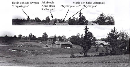 Gårdarna Uppibyn. Jakob Rabbs gård mitt i bild. Den andra bilden visar gårdsnamn, byggnader och stugor.