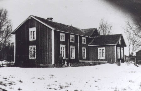 Isak Norrgård f. 1886 och Alfred Norrgårds f. 1888 gård på Norrstu, Alfreds utbyggnad. Framför gården Isak Norrgård, hustru Ida och dotter Annie Norrgård