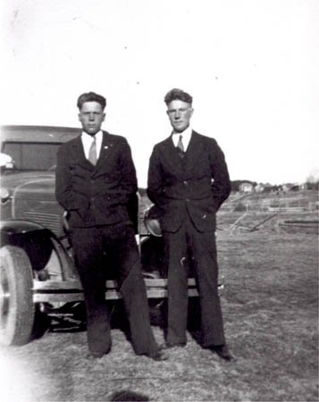 Ernst Rabb t. h. och Alvar Hellman t. v. I bakgrunden syns Wickströms och Isak Södergårds gårdar och då kan vi anta att bilden är tagen vid Vassor Uf och att det är John Wickströms bil de står framför.