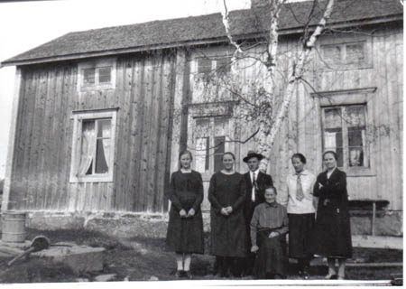 Karl Klemets gård på Herris stranden. Fr. v. Anni Klemets, Sigrid Klemets, Oskar Klemets, Maria f. Östman, Elvira och Ellen Klemets g. Söderberg.
