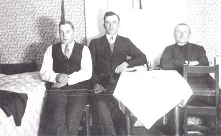 Karlar vid Hinders (Båskas). Fr. v. byggm. Åke Nyman (Bror Nymans farbror, byggm. på mudderverket), Viktor Hinders (Rönnviken), Vilhelm Sandvik.