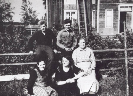Främre raden: Maria Åberg f. Södergård, Anna Wickström-Karlsson från Amerika, Greta Lisa Nykvist f. Södergård. Bakre raden: Sigfrid Nykvist, Georg Nykvist. Nykvists stuga Norribyn.
