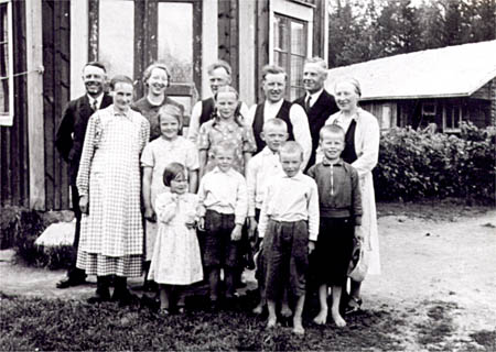 Nytomt syskonen med familjer framför Svarvars gård år 1938. De vuxna från vänster: 1. Johannes Björkman f. Wik 2. Ida Wik f. Vestermark 3. Etel Wik, dotter till Johan Erik Wik i Amerika 4. Albert Wik 5. Wiktor Svarvar 6. Edvard Wik 7. Ida Svarvar f. Wik. Barnen i bakre raden från vänster: 8. Alli Wik g. Petterson 9. Saga Wik g. Örnberg 10. Bengt Wik 11. Börje Svarvar. Barnen i främre raden från vänster: 12. Anna-Lisa Wik g. Grönberg 13. Bertel Wik 14. Rune Svarvar.