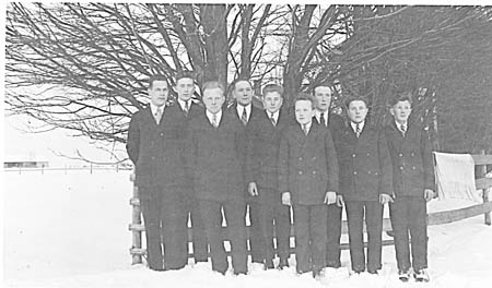 Slöjdkurs. Fr. v. Slöjdlärare 1. Martti Melin, 2. Erik Sandvik, 3. Robert Östman, 4. Arvid Rabb, 5. Sigurd Nykvist, 6. Gunnar Rabb, 7. Artur Wik, 8. Robert Udd och 9. Runar Beijar. Fotograferade hos Mickel Rabb på Sandåsen. I bakgrunden Sandéns uthus.