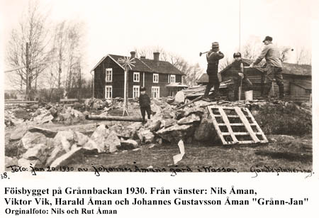 Stenfähusbygge på Grånnbacken. Fr. v. Nils Åman, Wiktor Wik, Harald Åman och Johannes Åman ”Grånn-Jaan”.