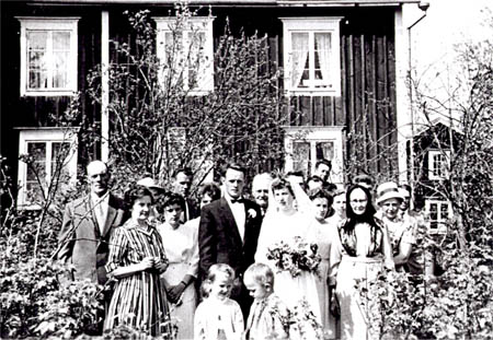 Brudparet Siv Wik f. Vasberg och Bertel Wik med gäster 10.6.62. Fr. v. 1. Hugo Vasberg, 2. Elin Vasberg, 3. Inger Vasberg, 4. Harry Wik, 5. Bertel Wik, 6. Albert Wik, 7. Siv Wik f. Vasberg, 8.Greta Örnberg g. Wiklund, 9. Östen Pettersson, 10. Rose Rabb g. Sandvik, 11. Bertel Örnberg, 12. Oline Svarvar f. Nygård, 13. Ida Wik f. Westermark, 14. Saga Örnberg f. Wik, 15. Bengt Wik