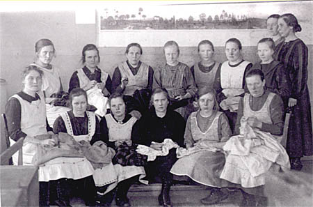 Sykurs i Vallvik folkskola. Övre raden fr. v. 1. Aili Skog, 2. Elin Holm, 3. Lisa Paro, 4. Else Galls, 5. Senny Stenman, 6. Aina Galls, 7. Edit Åman, 8. Edit Stenman lärare i Vallvik, samt kursledaren 9. Edit Rönnbacka. Främre raden fr. v. 10.Maria Haldin, 11. Ester Finne, 12. Tyra Haldin, 13. Adele Örn, 14. Aleksandra Holm g. Storbacka och 15. Davida Wasberg.