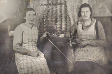 Irene Rabb f. 1895 och Ester Storbacka / Ohlis f. Wallén vid Irenes stickmaskin på Sandåsen 1934. Irene var i lära i Tammerfors och stickade delar som sedan syddes ihop av Ester. Också Etel Sandén sydde åt Irene i slutet av 30- och början av 40-talet.