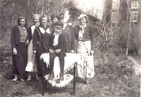 Johannes Åmans "Grånn-Jaanas" gård och uthus i bakgrunden Ida Örn från ”Friibäs Noribyn”, Edna Frantz g. Kalander, Ingrid Storbacka, Ester Storbacka, Elna Wik, Nelly Åman och Nils Åman på bordet.