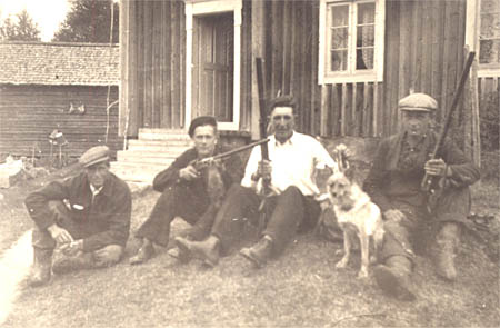 Fyra jägare vid Lövgårds i Spikan. 1. Alfred Backman, 2. Albin Grop, 3. Albin Lövgård, 4. Einar Kalander.