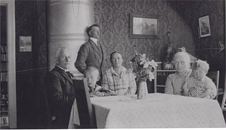 Victor Ahlskog med fam. + svärföräldrar, Irenes far, Fjalar Ahlskog, Viktor Ahlskog, Irene Ahlskog f. Finne, Irenes mor och okänd.