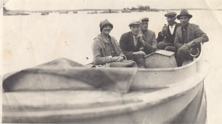 Lingonplockningsutfärd med motorbåt i skären fr. v. Maria Rabb g. Nyman, Erik Sandvik, Emil Wasberg, Hugo Sandvik motorbåtsägare och Emil Rabb (Sandåsen).