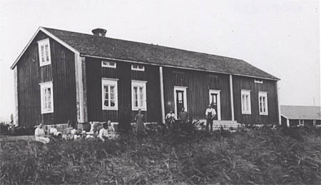 Skolhemmanet, Hinders, karaktärsbyggnad på Bodstranden. Arrendator Herman Hinders med en del av familjen. Vid vänstra gaveln ligger diskade delar av separatorn (miejjarin).