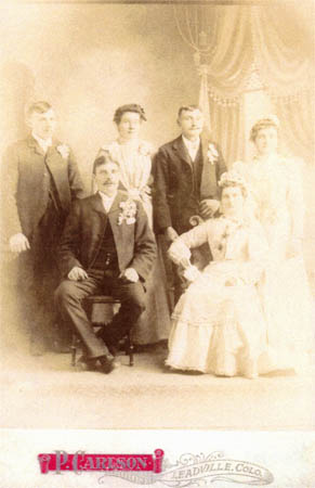 Bröllop: Edvard Örn och Brita Stina Rabb i Leadville, Colorado. I bakre raden står Johannes Örn, Sofia Kuni g. Bäck, John (Johan) Forsman/Kuni och Maria Kuni.