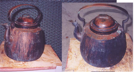 Stora kaffepannor tillverkade av Sanfrid Fribergs förfäder. De är osignerade men detaljerna avslöjar att de är gjorde på Hagnäs.