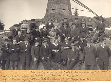 Vörå Folkhögskola 1915–1916. Översta raden fr. v. Ida Westermark g. Wik (Nytomt), ?, ?, Ester Bergfors g. Sand, första raden fr. v. Alfred Rabb (Sandåsen), första raden Fr. h. ?, Emil Wasberg (Villis).
