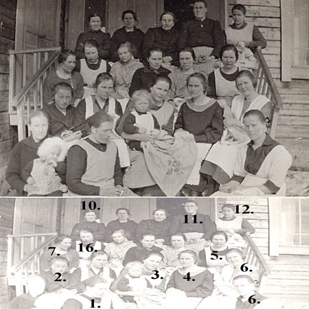 Sykurs på skolan i Kuni 1925. Fr. v. 1. Vendla Backman, 2. Ellen Kuni, 3. Elin Nyman med Kurt West i famnen, 4. Ida Forsén, 5. Tilda Kuni, 6. Granérs systrar, 7. Ida Flinkfelt, 8. Irene Forsman, 9. Södergård, 10. Maria Berg, 11. Sofia Bäck, 12. Helga Kuni, 13. Ida Berg, 14. Hulda Willför, 15. Ida Sandvik, 16. Irene Forsman och 17. Edit Studd.