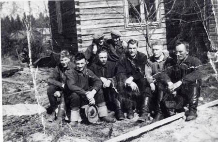 Skofabrik: Evald Örn, Arvid Forsén, Arne Wahlström, Saarinen, Gustav Haldin och Vilho Koivisto. Bakom: Valdemar Smeds och Arne Örn