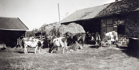 Arvid Åbergs kor väntar på att komma in (på fäggoålin). Arvid till vänster. Då ladorna i Kärri revs togs takteglen till ladan som på bilden är lagd med nya pärtor. Längst bor syns "Fassis föise" som ännu inte rivits. Karelarna hade en ko där. Stallet och stallsporten till vänster.