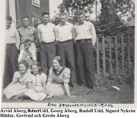 Arvid Åberg, Robert Udd, Georg Åberg, Rudolf Udd, Sigurd Nykvist, Hildur Åberg g. Mälsor, Gertrud Åberg g. Wik och Gerda Åberg framför Åbergs trädgårdsland. Början av 30-talet. Georg stupade i vinterkriget. Stupad